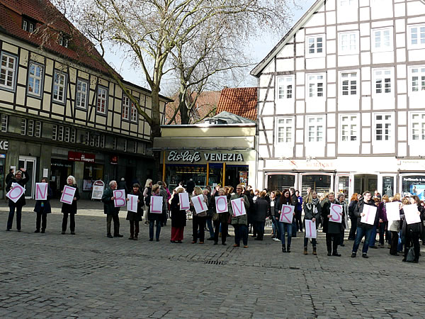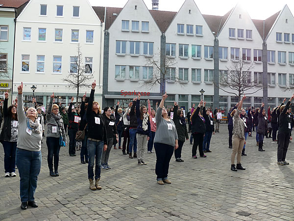 Unter Leitung von Stefanie Feldmann vom Soester Ballettstudio kamen Frauen und Männer zusammen, um - wie in anderen 200 Ländern an diesem Tag - das Ende von Gewalt an Frauen und Mädchen zu fordern. Im Jahr 2014 sind 1 Milliarde Menschen weltweit für diese Forderung auf die Straße gegangen und haben getanzt.