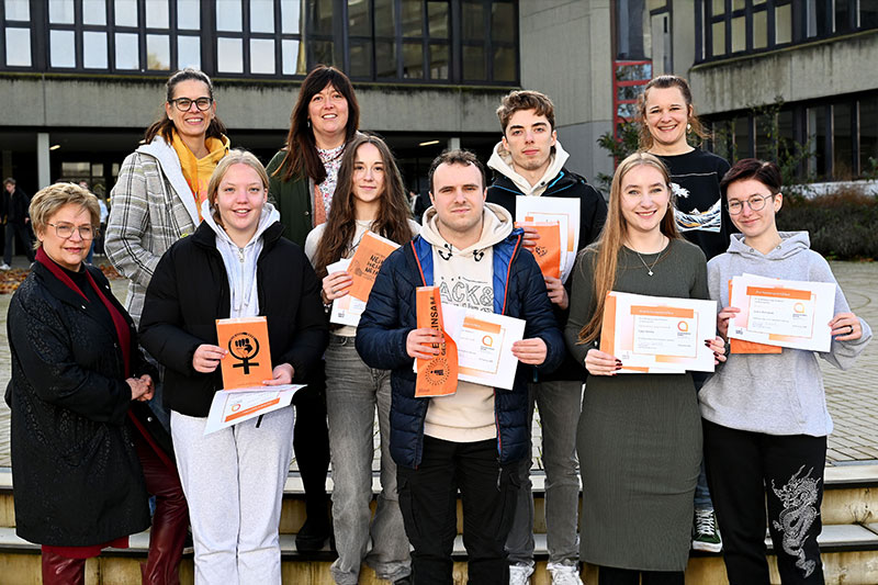 Nadine Terhörst (Lehrerin am Börde-Berufskolleg, 4.v.l.) und Mareike Pendzialek (Schulsozialarbeiterin am Börde-Berufskolleg, 2.v.r.) haben die Umsetzung des Wettbewerbs an der Schule begleitet. Britta Thulfaut (2.v.l.) und Barbara Batzik (Frauenberatung Soest, links) haben den kreativen Einsatz der Schülerinnen und Schüler für den Aktionstag mit Zertifikaten und Gutscheinen belohnt. Teilgenommen haben Sophie Vonnahme (3.v.l.). Lara Jatzke (5.v.l.), Jona Kremser (Gewinner, 5.v.r.), David Klug (4.v.r.), Laura Berisha (3.v.r.) und Jasmin Kahraman (rechts). Auf dem Foto fehlen die Schülerinnen Leni Farke, Lauren Laws, Helena Lemke und Emily Schachlow. Foto: Kira Hönicke/ Kreis Soest